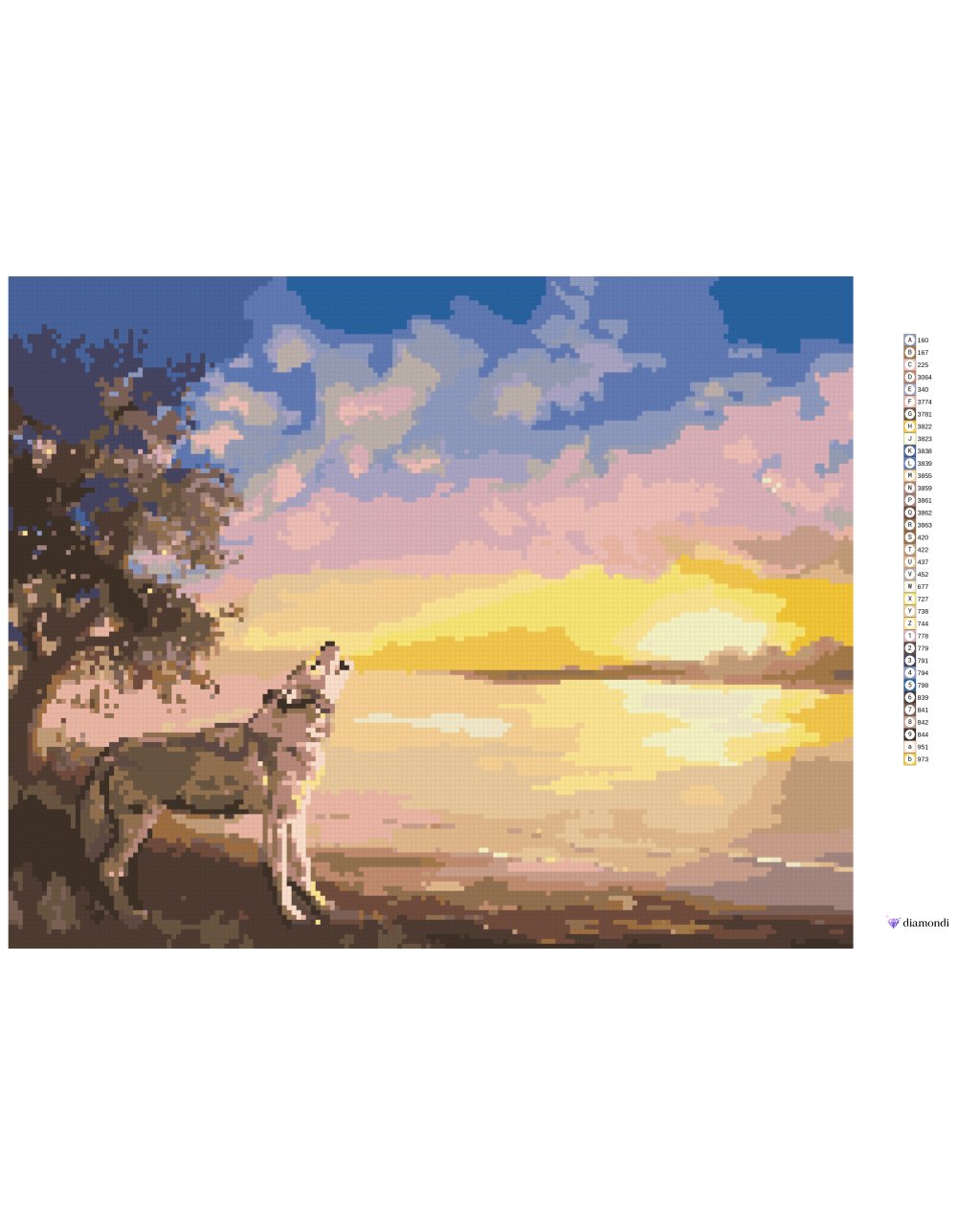 Diamantové malování - VYJÍCÍ VLK A ZÁPAD SLUNCE U VODY (D. RUSTY RUST)