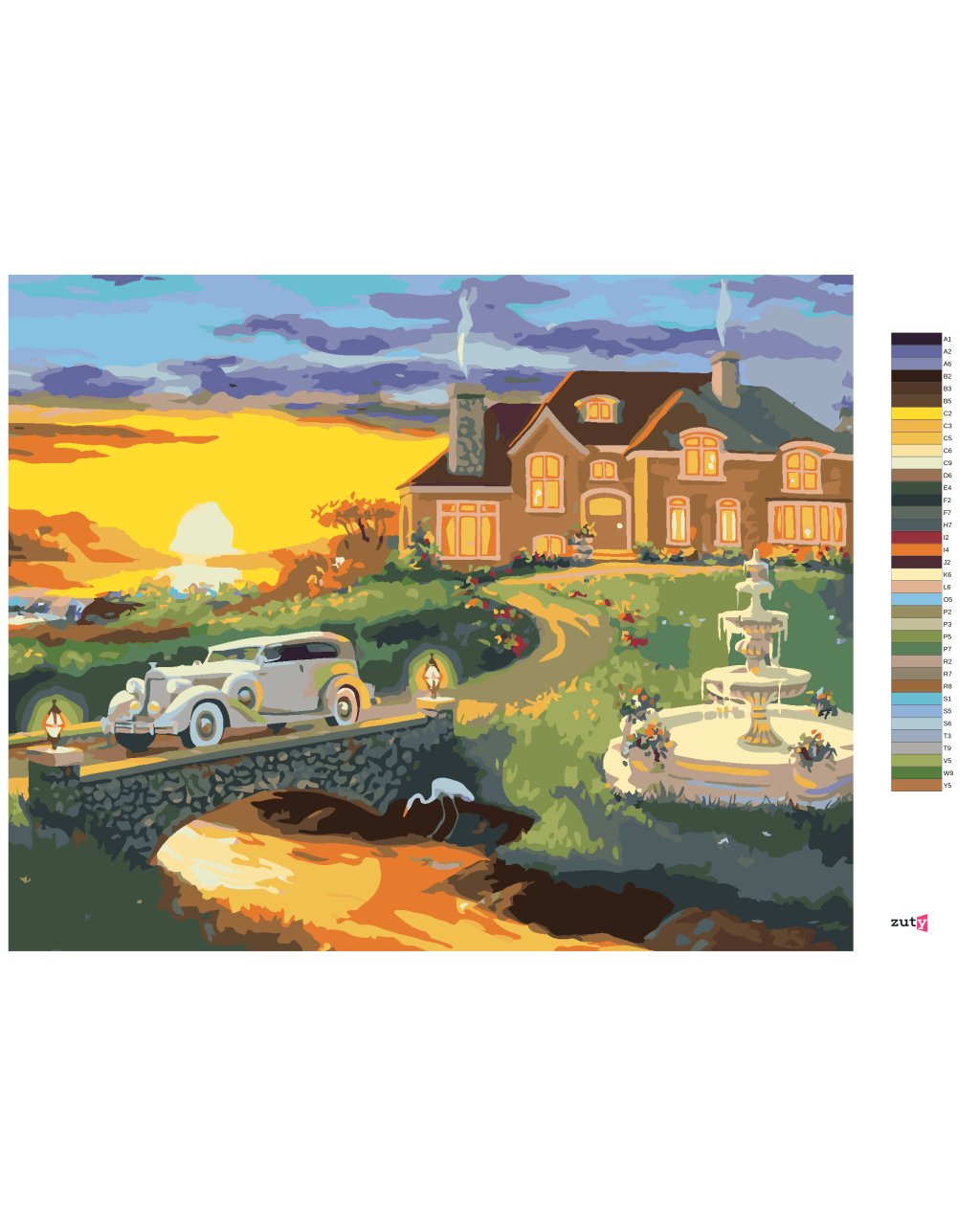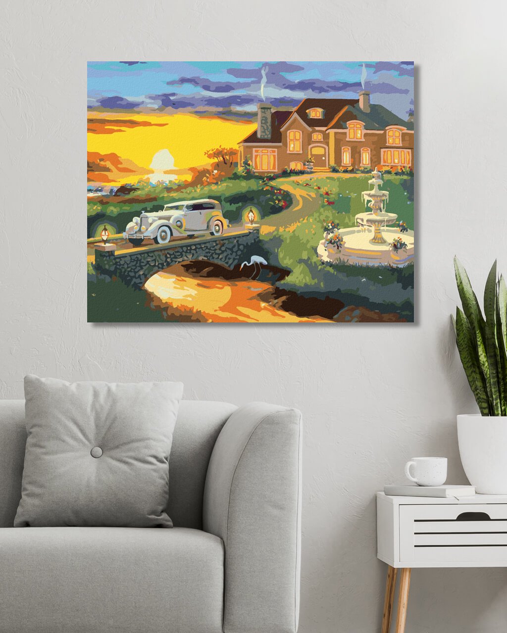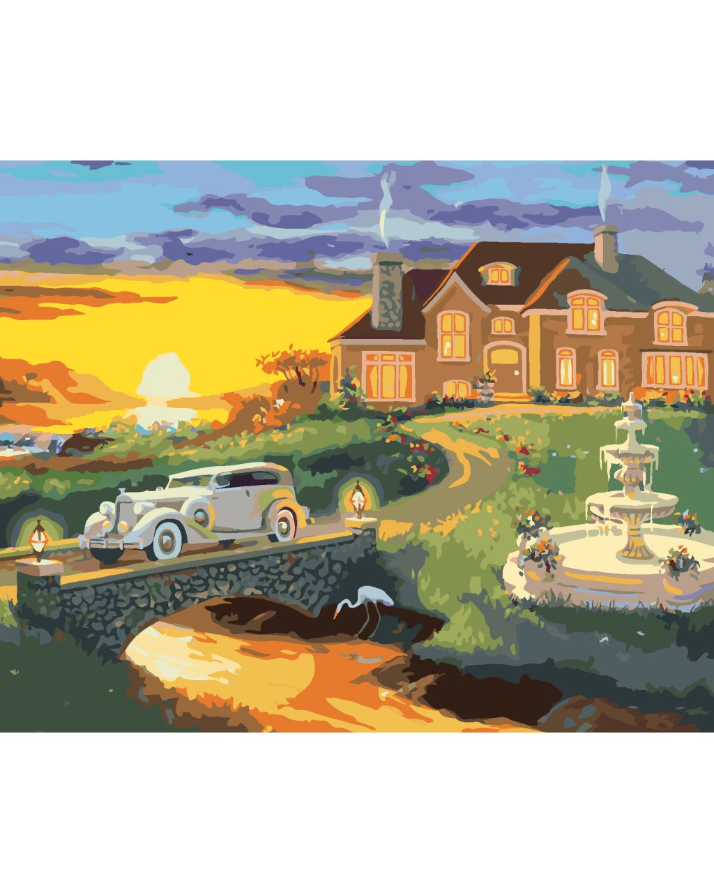 Malování podle čísel - BÍLÉ AUTO ODJÍŽDĚJÍCÍ OD DOMU A ZÁPAD SLUNCE (D. RUSTY RUST)