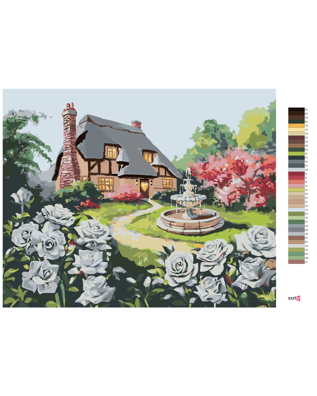 Malování podle čísel - BÍLÉ RŮŽE A DŮM S FONTÁNOU (D. RUSTY RUST)