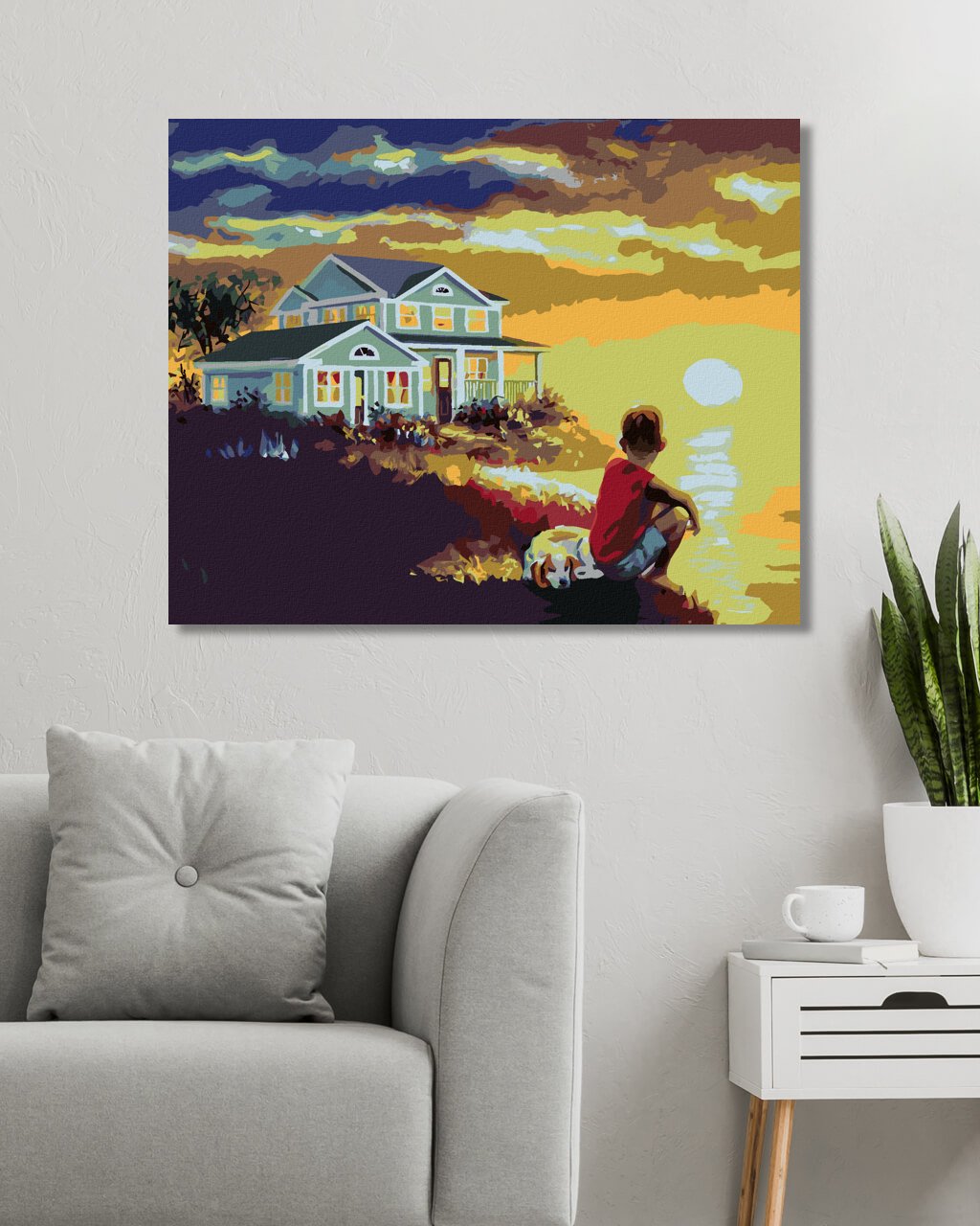Malování podle čísel - CHLAPEC SE PSEM U MOŘE A ZÁPAD SLUNCE (D. RUSTY RUST)