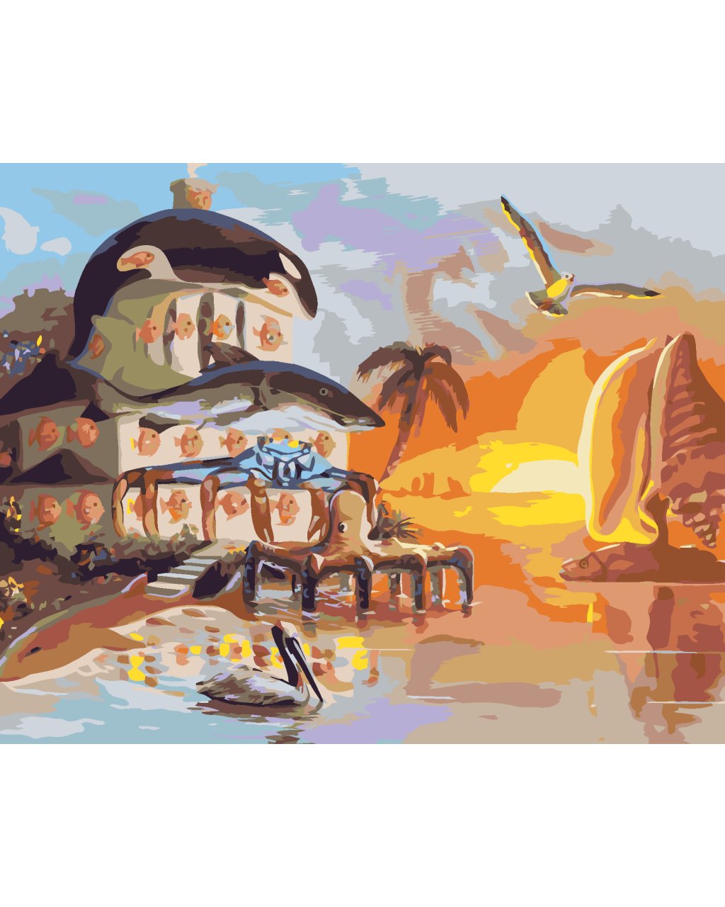 Malování podle čísel - DŮM A PLACHETNICE Z MOŘSKÝCH TVORŮ A ZÁPAD SLUNCE (D. RUSTY RUST)