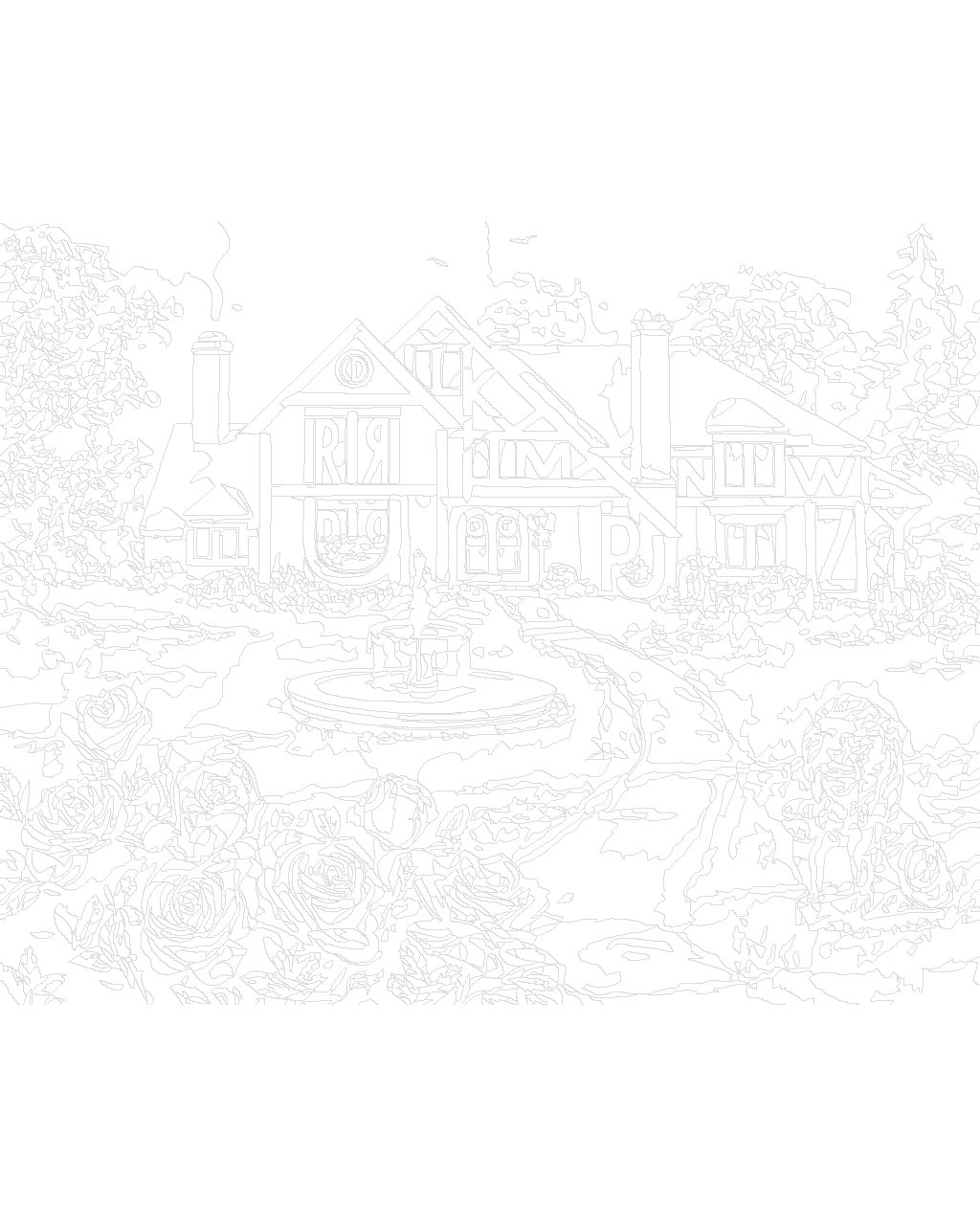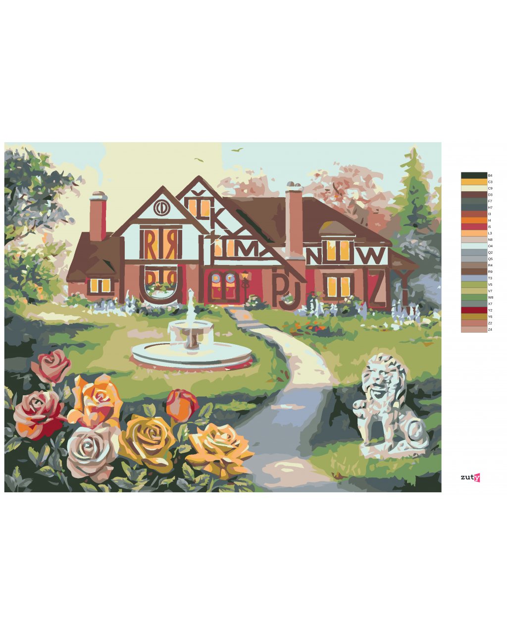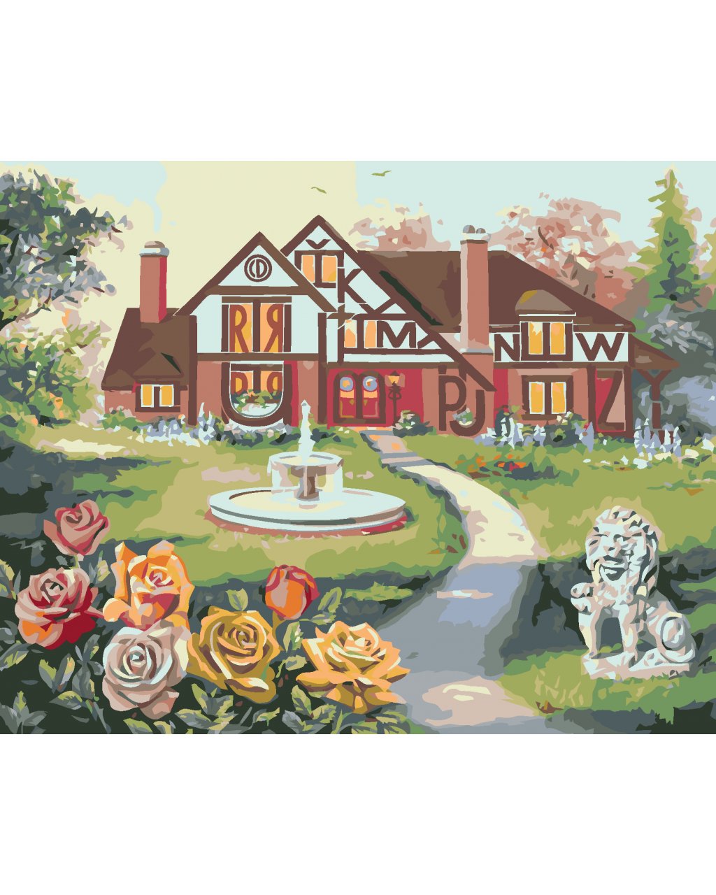 Malování podle čísel - DŮM S PÍSMENY A FONTÁNOU, RŮŽE A SOCHA LVA (D. RUSTY RUST)