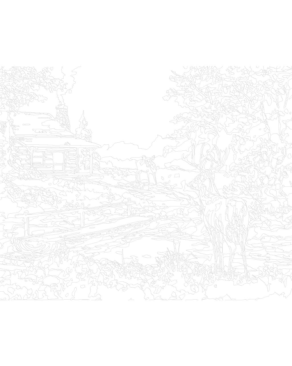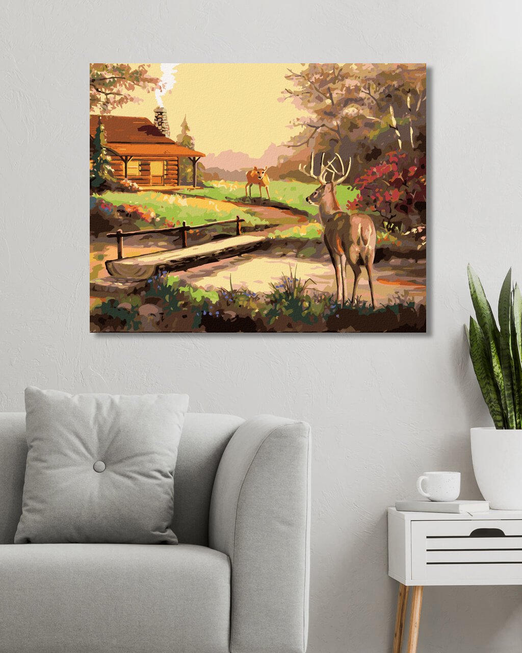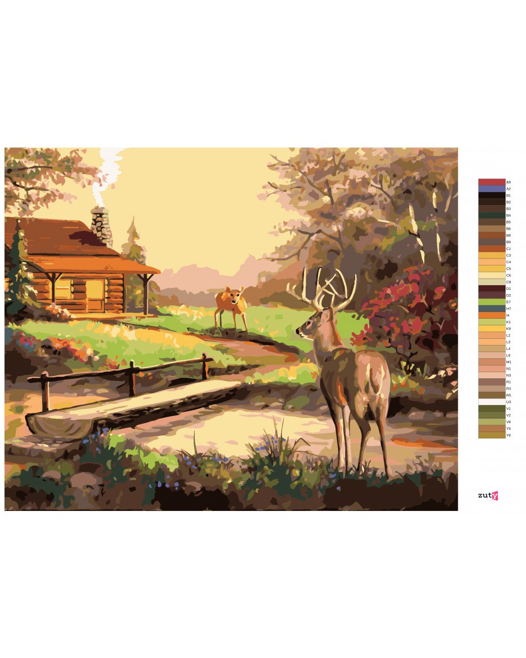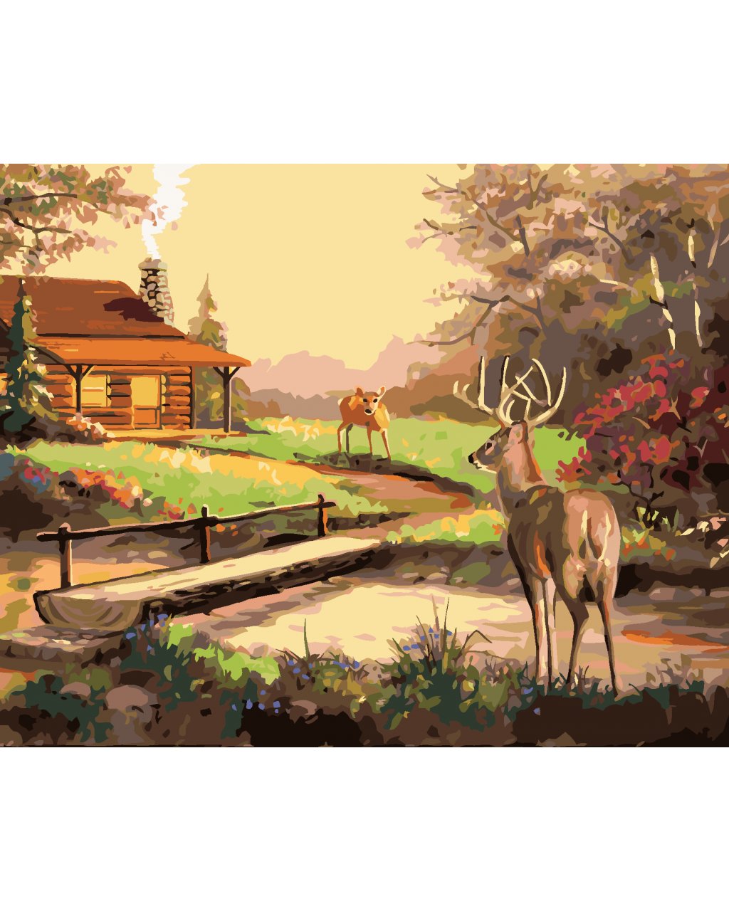 Malování podle čísel - JELEN, CHATA A ZÁPAD SLUNCE (D. RUSTY RUST)