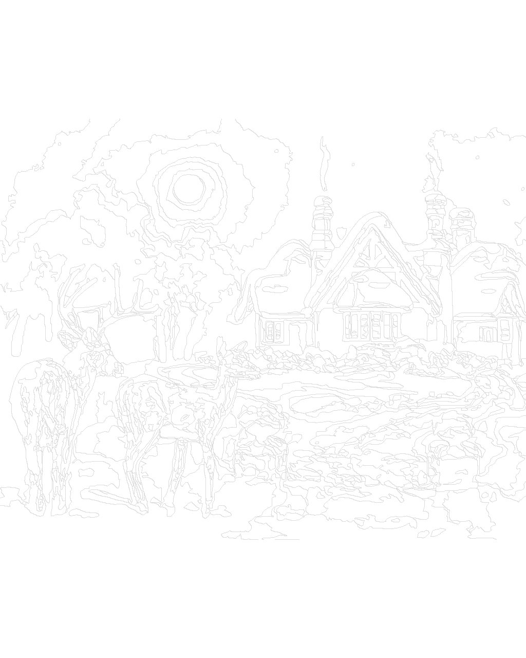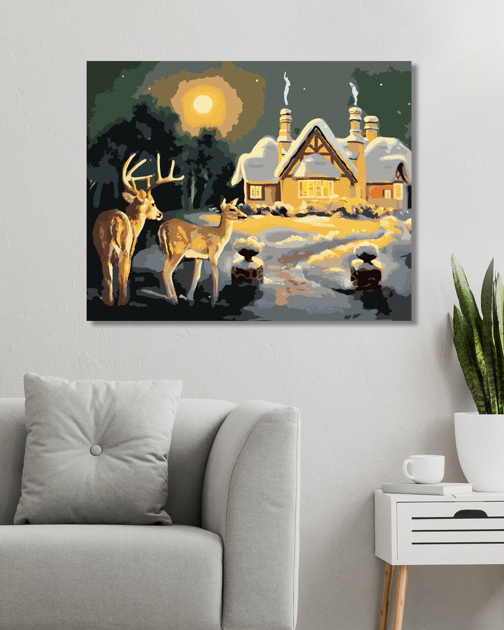 Malování podle čísel - JELEN A LAŇ U ZASNĚŽENÉHO DOMU (D. RUSTY RUST)