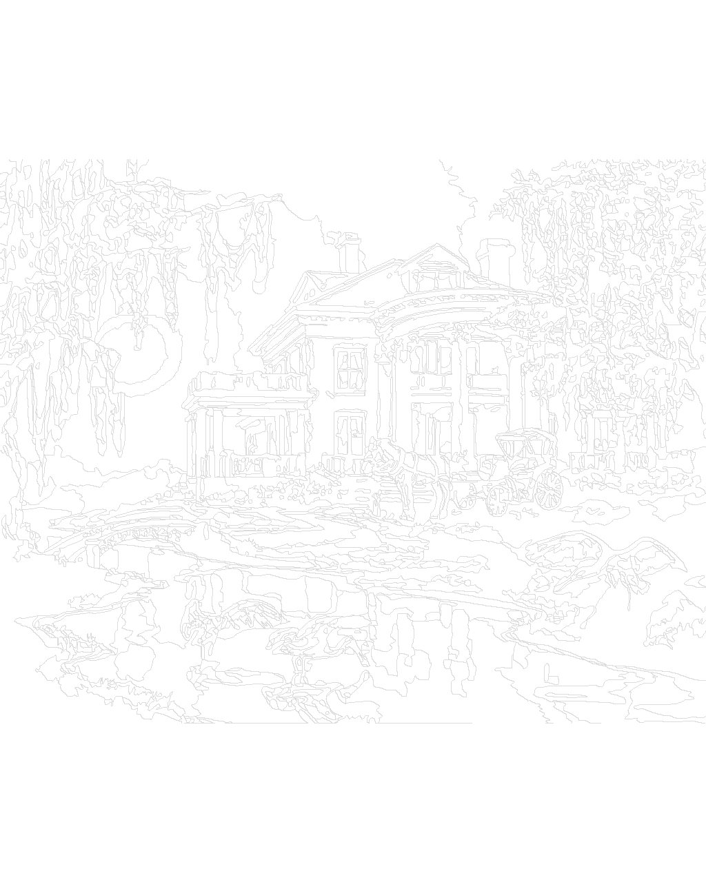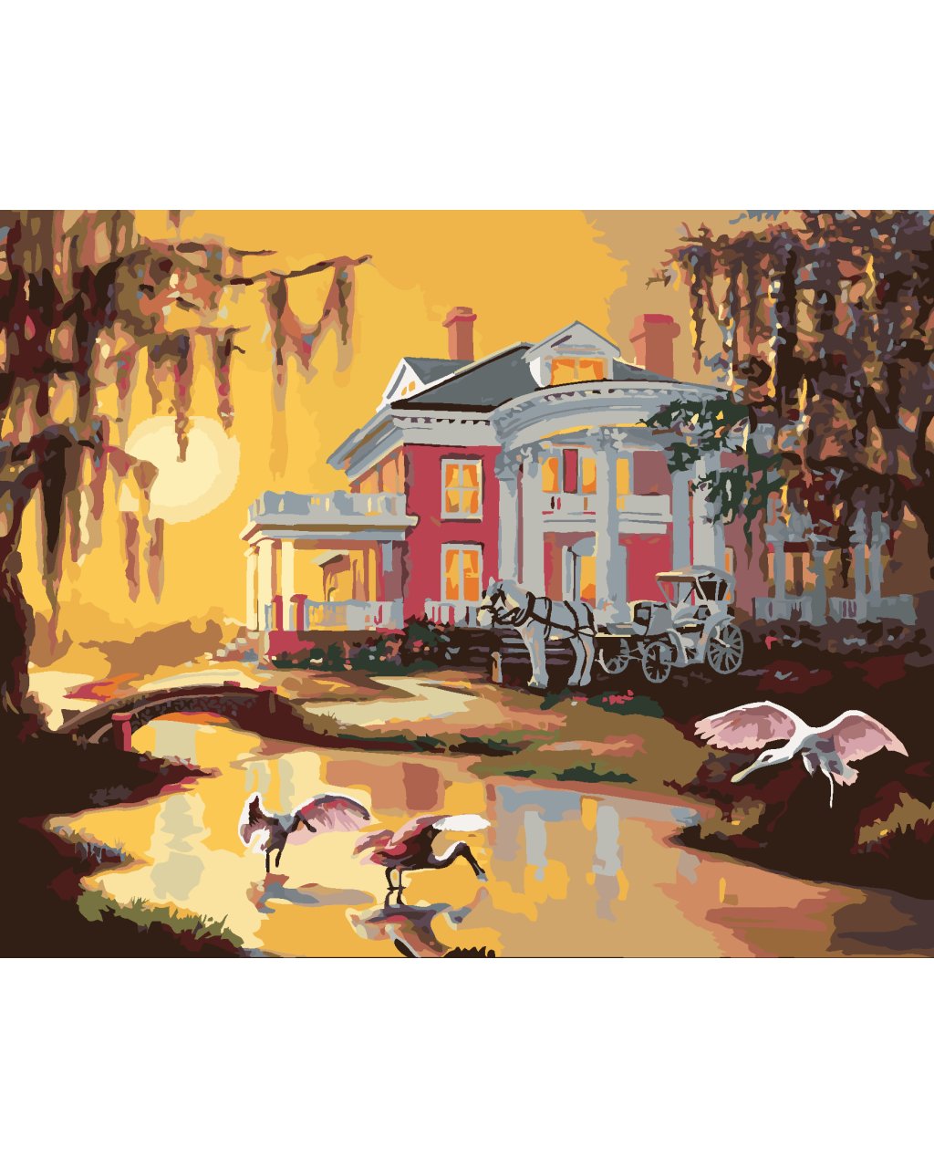 Malování podle čísel - KOČÁR S BÍLÝM KONĚM U DOMU, PTÁCI A ZÁPAD SLUNCE (D. RUSTY RUST)