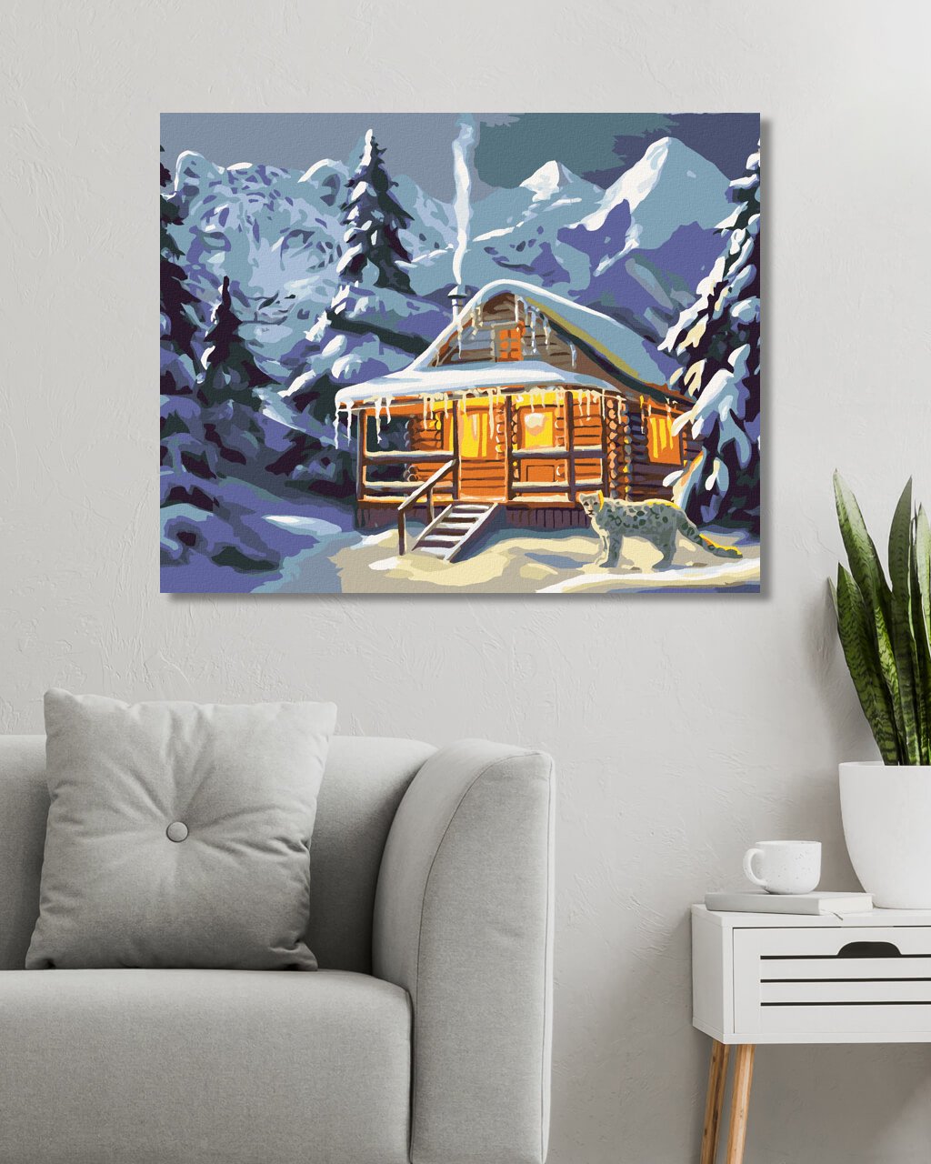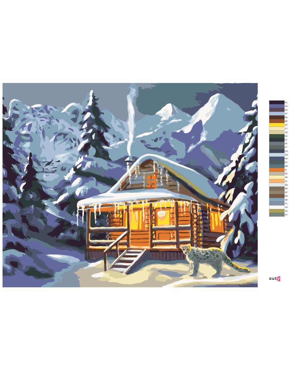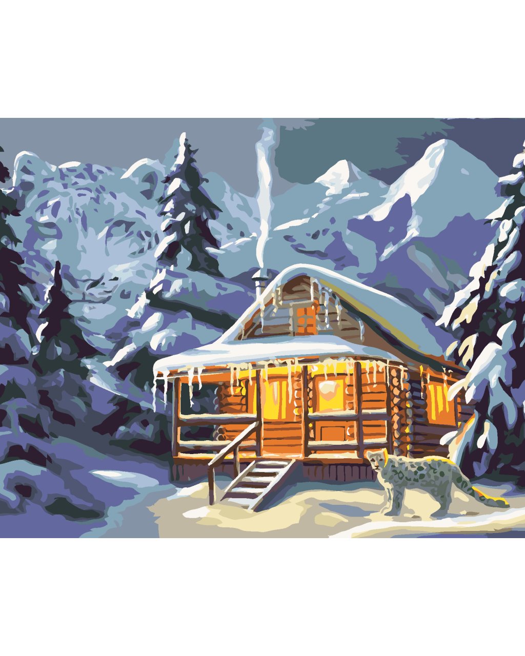 Malování podle čísel - LEOPARD U ZASNĚŽENÉ CHATY (D. RUSTY RUST)