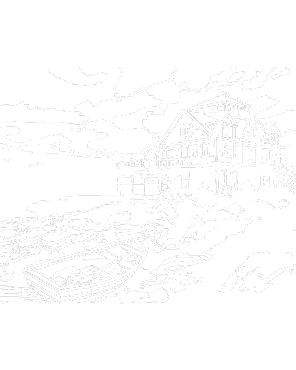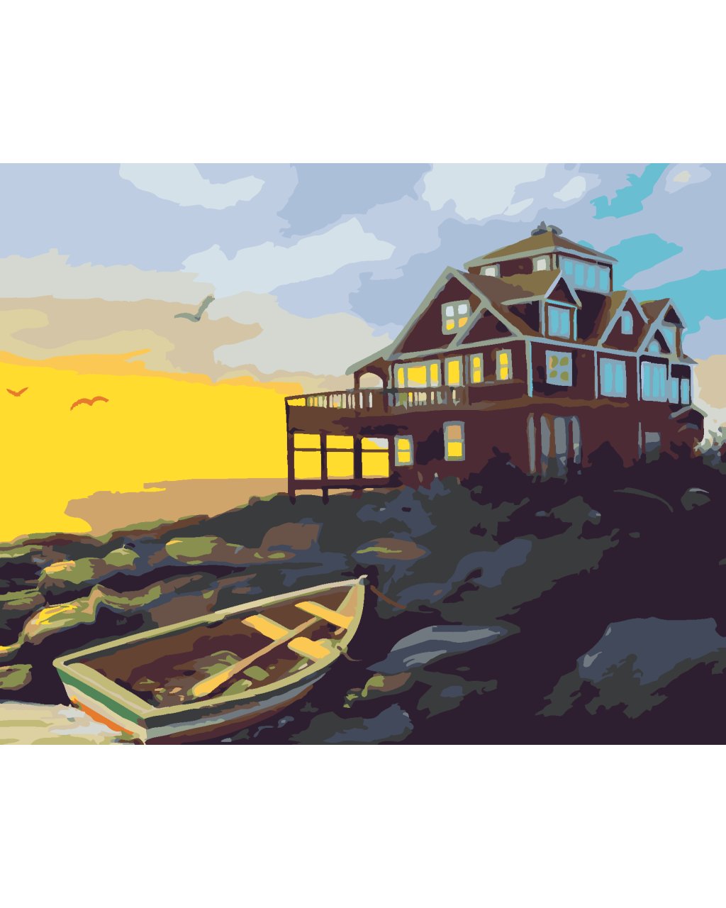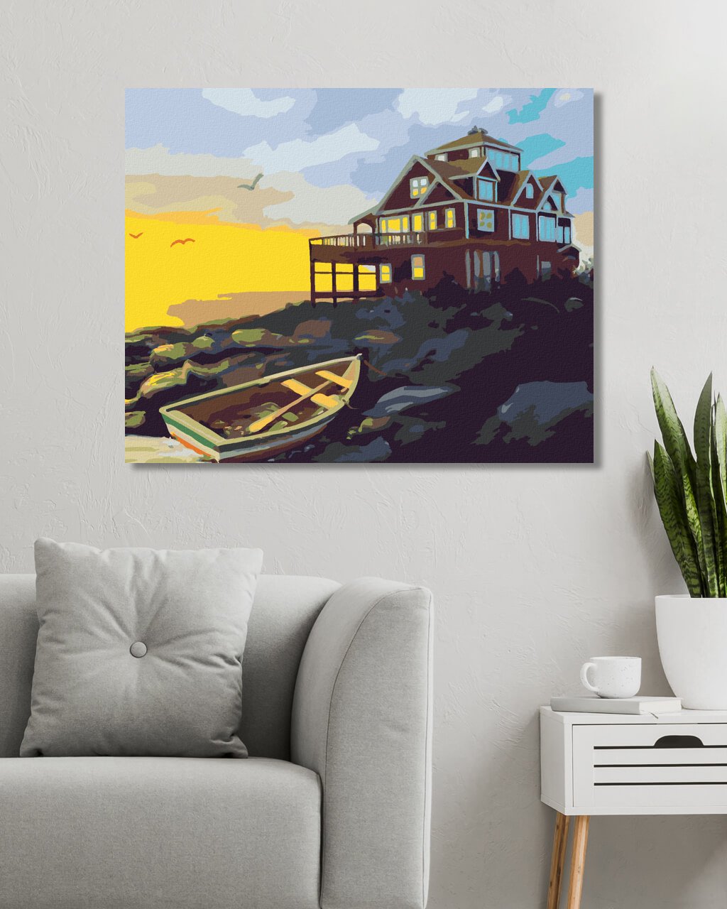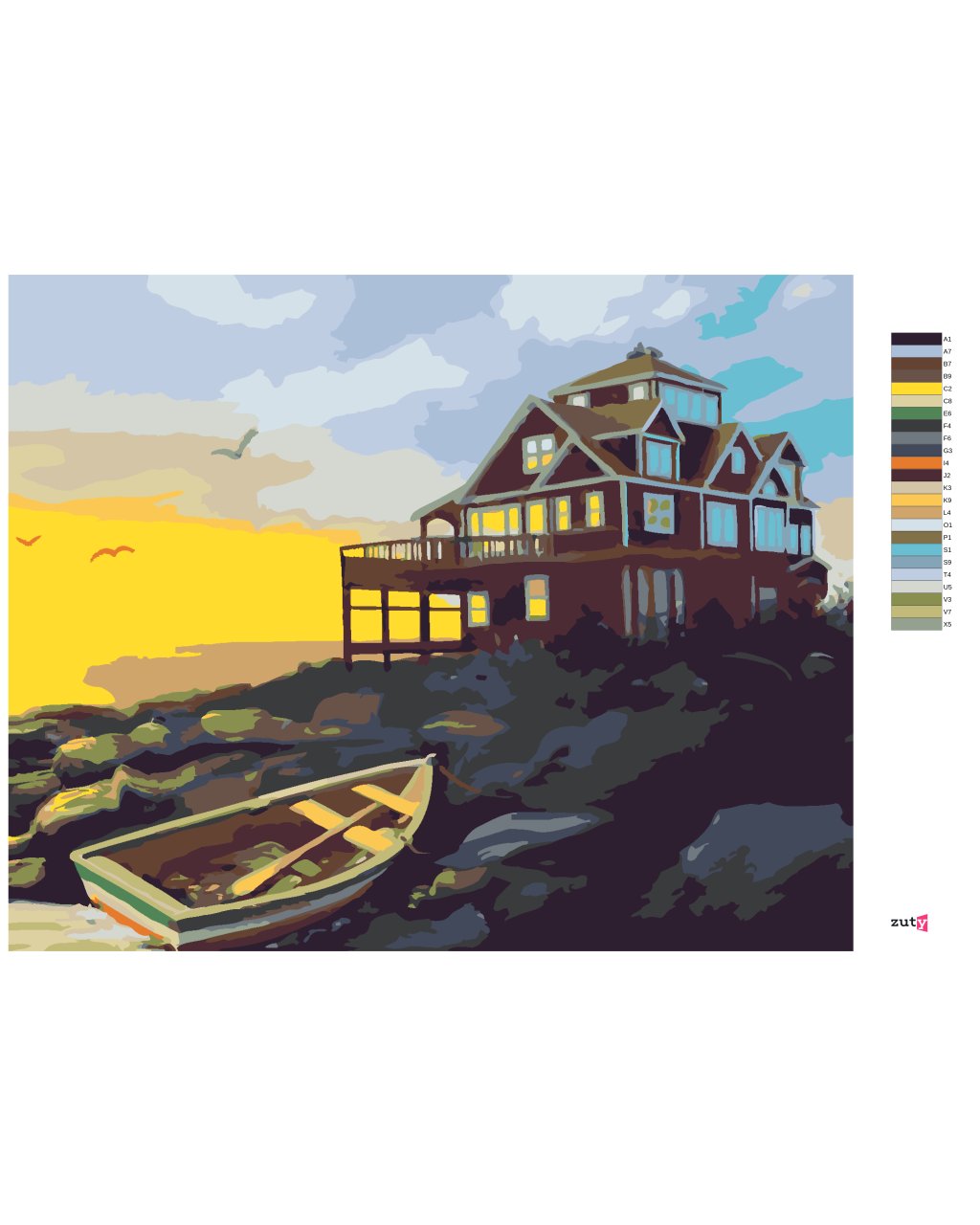 Malování podle čísel - LOĎKA, DŮM U POBŘEŽÍ A ZÁPAD SLUNCE (D. RUSTY RUST)