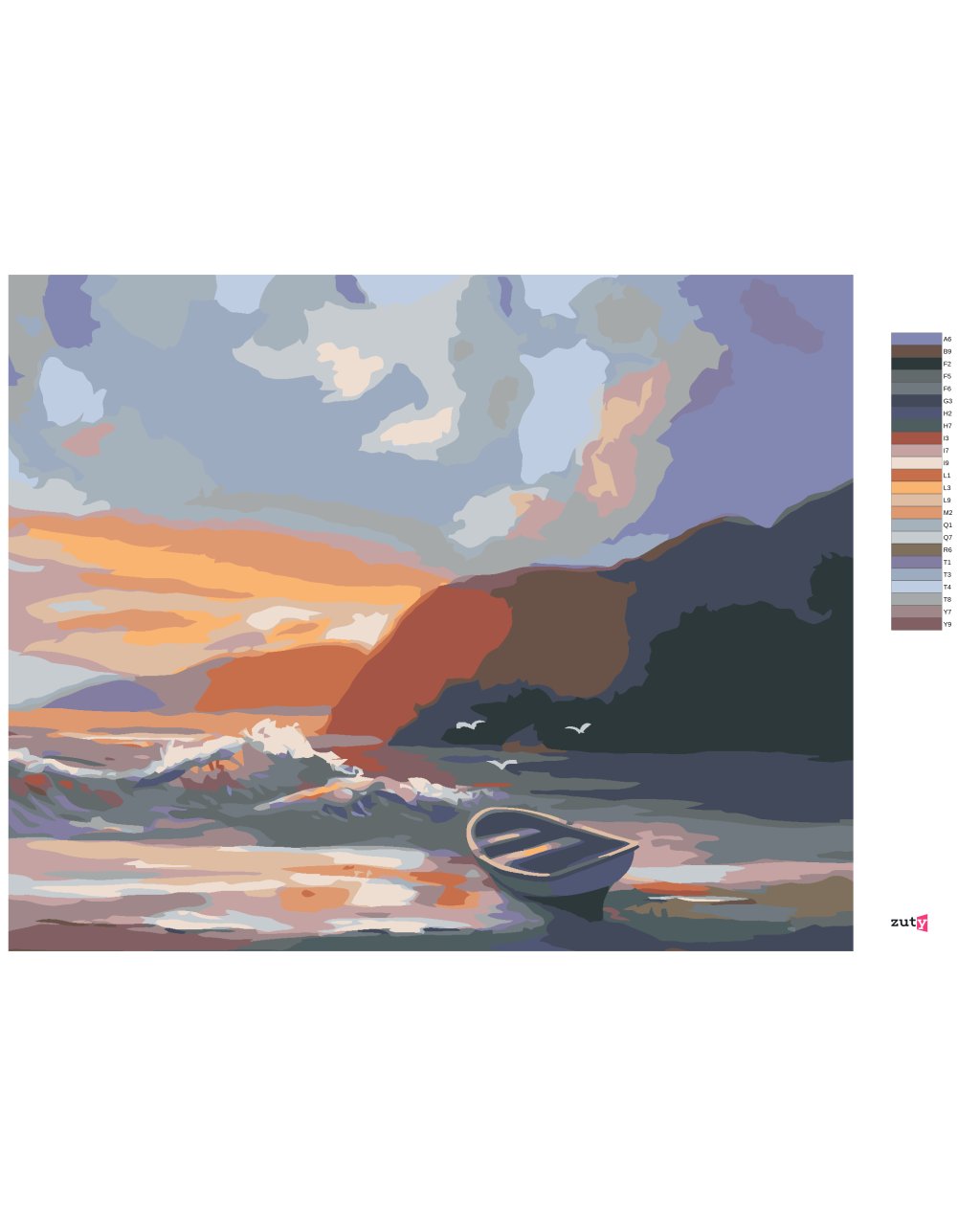 Malování podle čísel - LOĎKA NA POBŘEŽÍ, VLNY A ZÁPAD SLUNCE (D. RUSTY RUST)