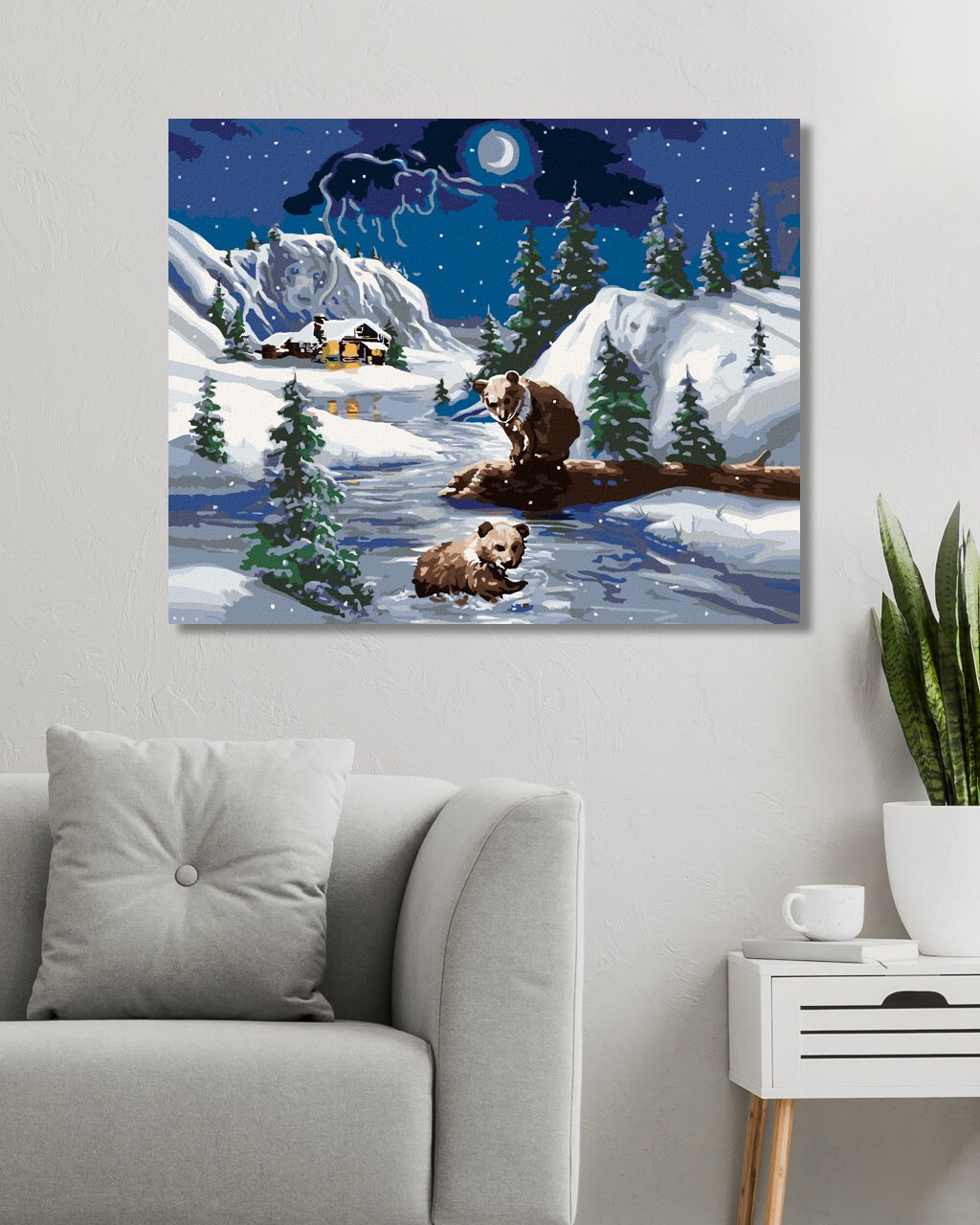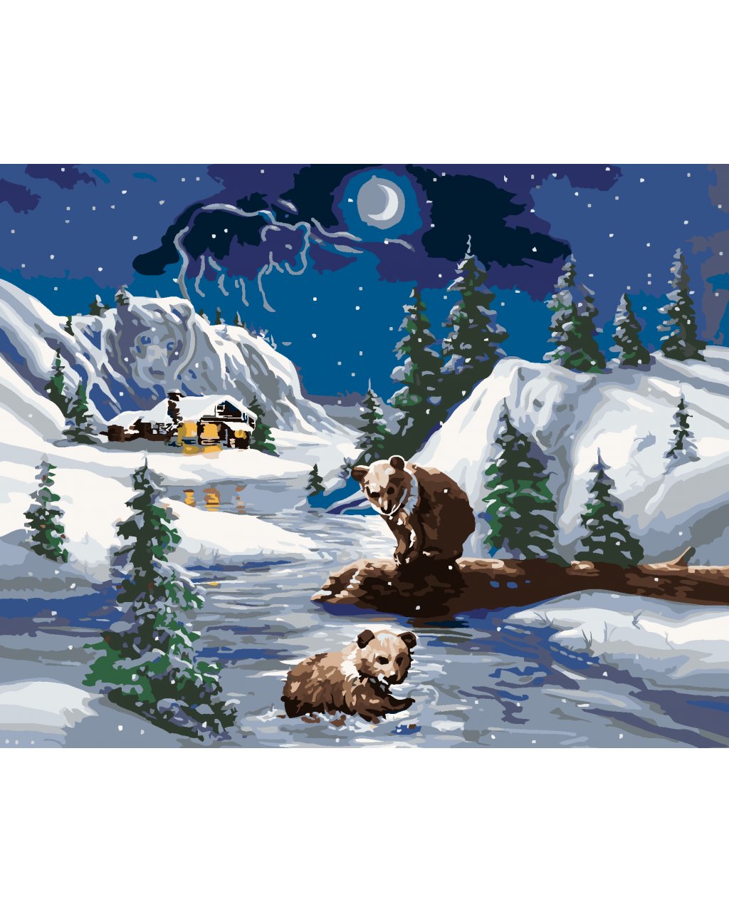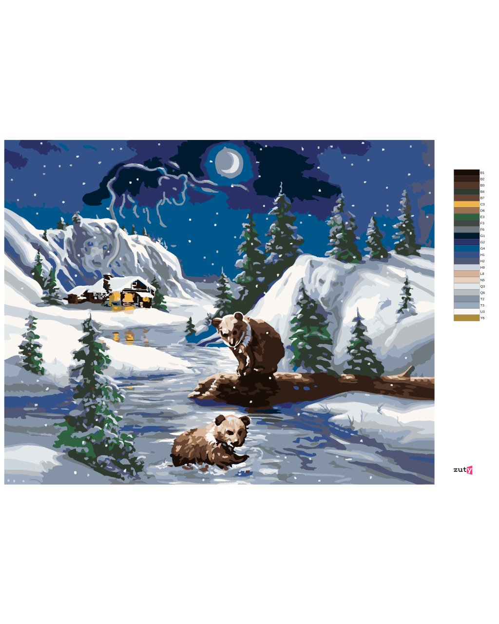 Malování podle čísel - MEDVĚD U ŘEKY, CHATA A MĚSÍC (D. RUSTY RUST)