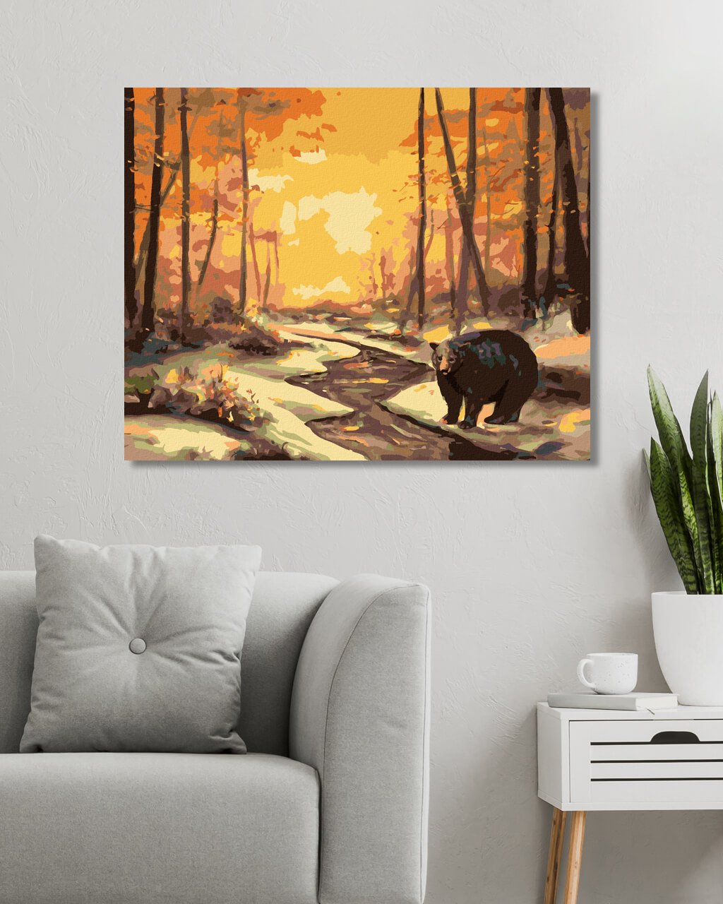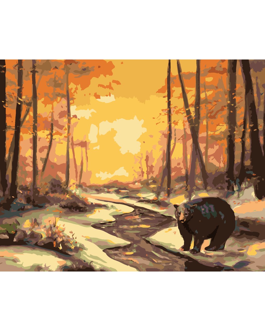 Malování podle čísel - MEDVĚD U ŘEKY V ZIMĚ A ZÁPAD SLUNCE (D. RUSTY RUST)