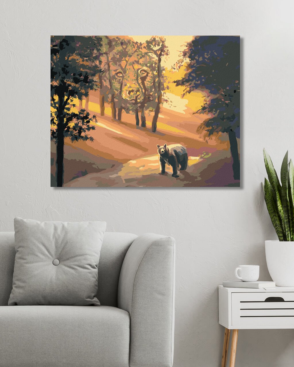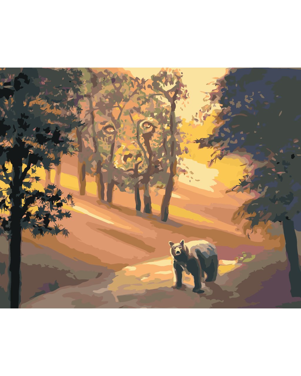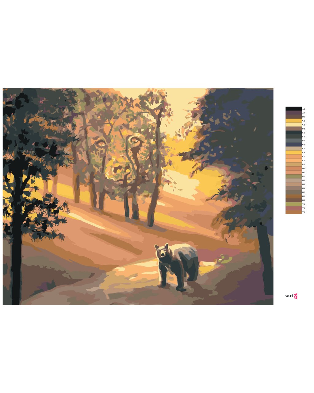 Malování podle čísel - MEDVĚD V LESE A ZÁPAD SLUNCE (D. RUSTY RUST)