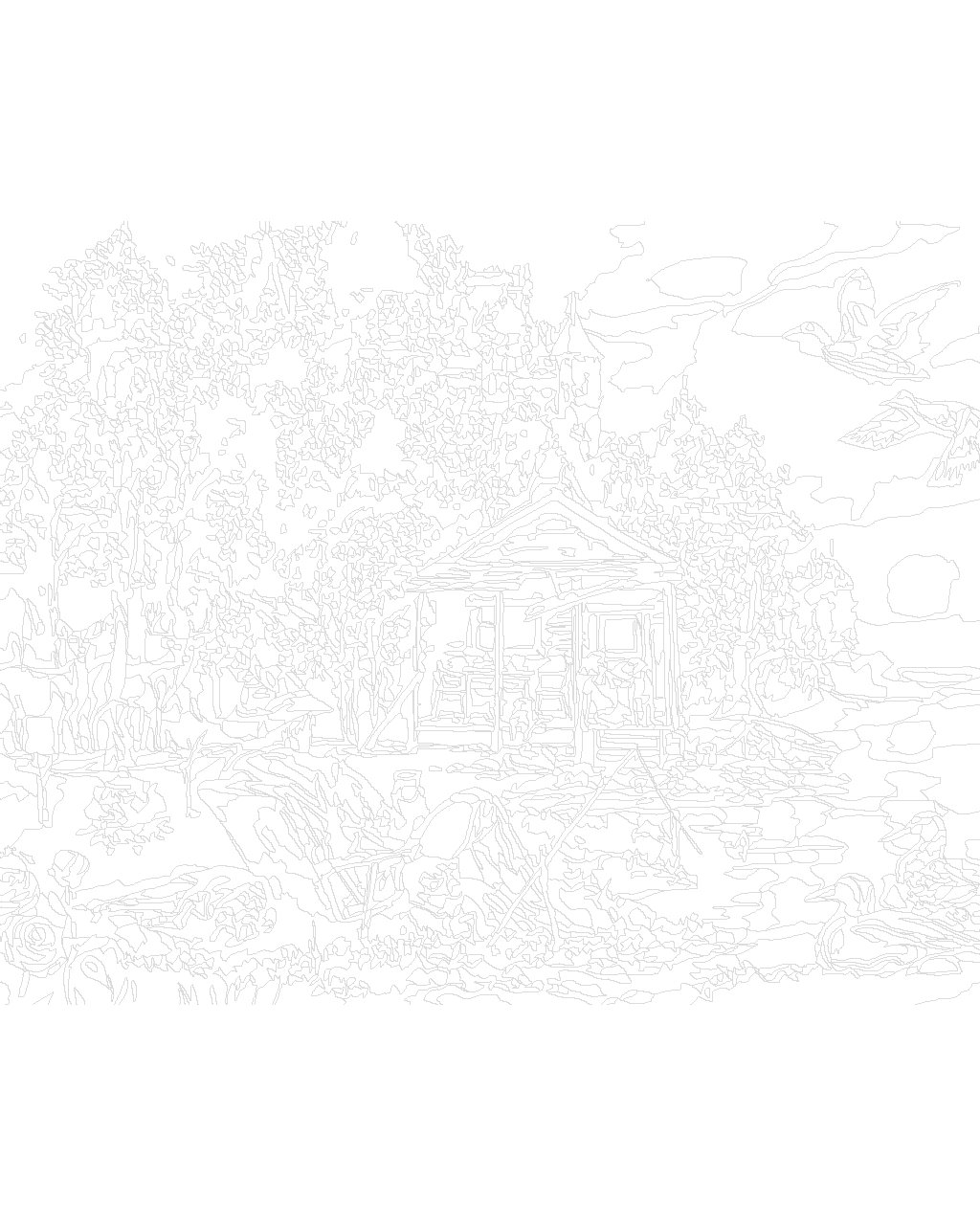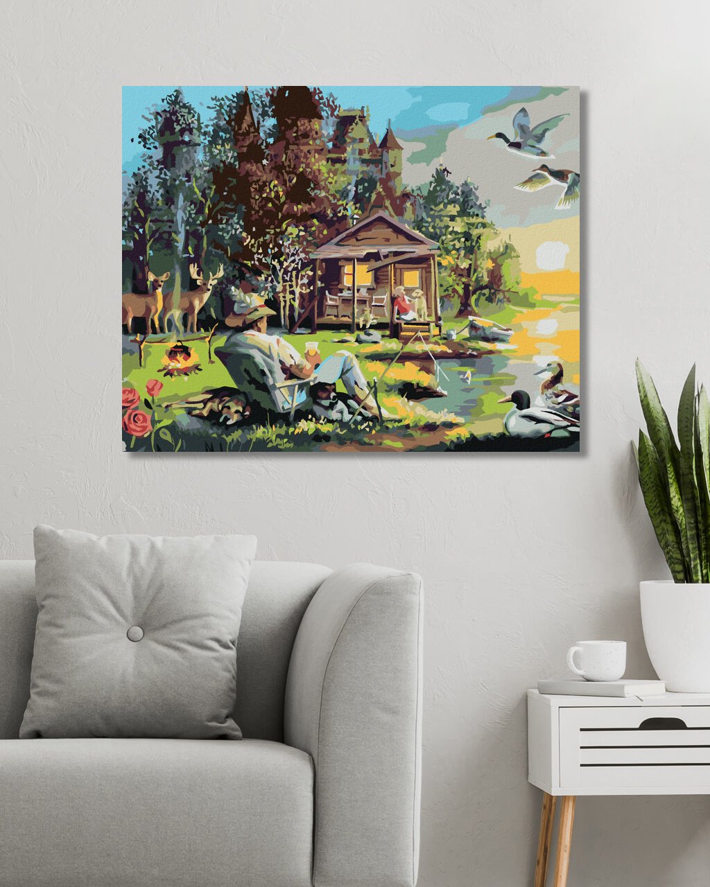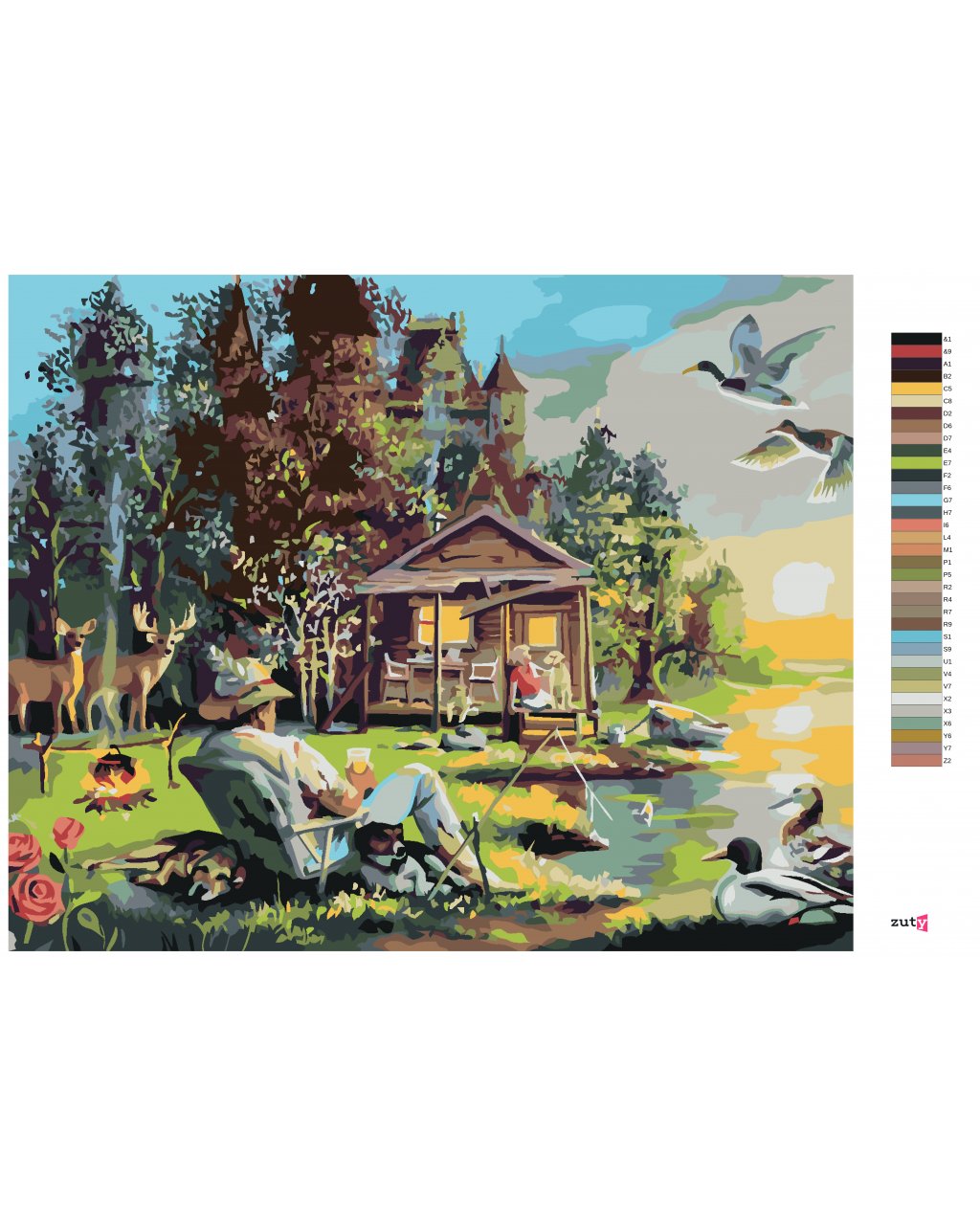 Malování podle čísel - MUŽ SE PSY RYBAŘÍCÍ U JEZERA, CHATA, KACHNY A JELEN (D. RUSTY RUST)