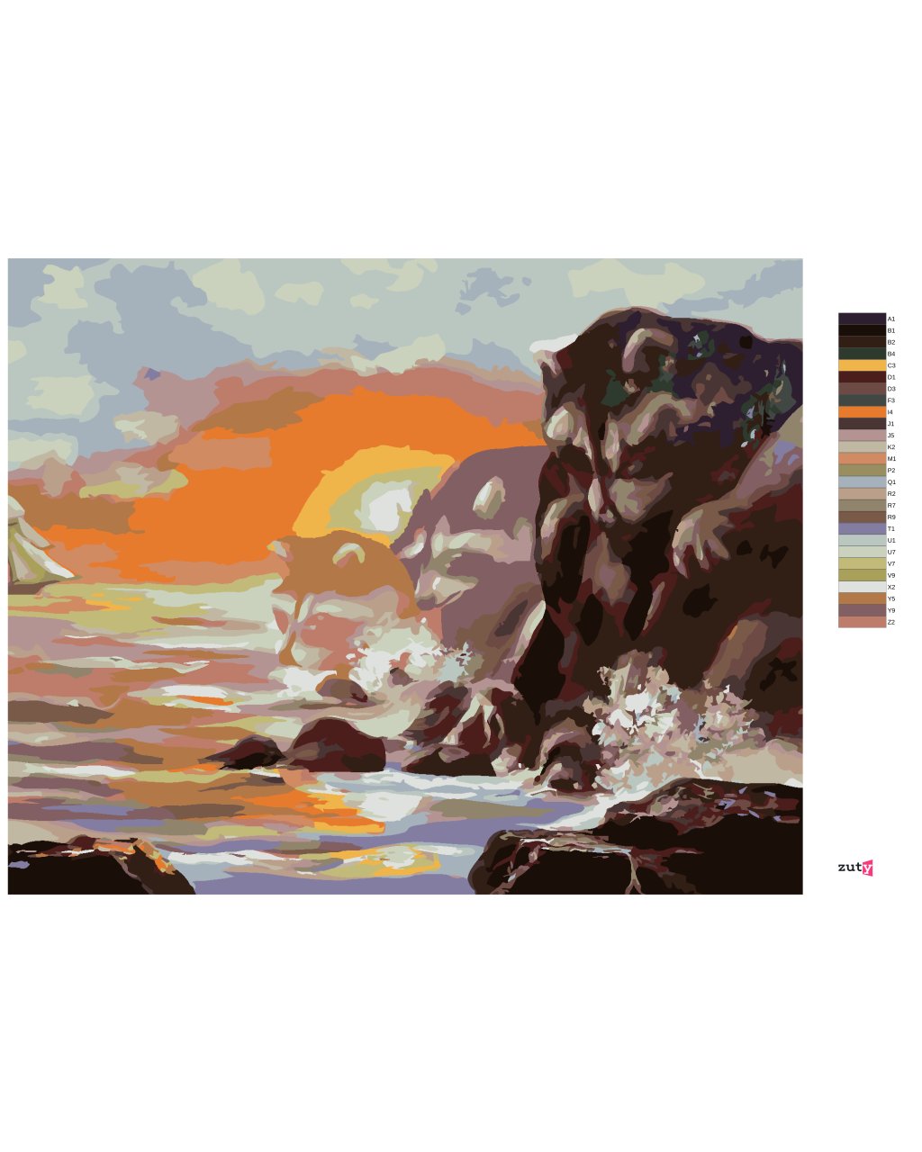 Malování podle čísel - PLACHETNICE, MÝVAL, SKÁLY, MOŘE A ZÁPAD SLUNCE (D. RUSTY RUST)