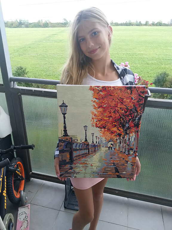Kdyz jsem obraz videla,myslela jsem, ze to nedokazu. Kdyz jsem zacala, nemohla jsem se od malovani odtrhnout, takze hodiny utikaly jako voda a ja byla do toho tak zabrana, ze jsem vubec okoli nevnimala. Je to obrovsky relax a ta nadherna radost kdyz obraz dokoncim, to se neda vypovedet. Je to parada !!! Namalovala jsem uz 7 obrazu, rozdavam je v rodine jako darky. Jak nemam co malovat, tak se nudim. Malovani je pro me nejmilejsi zabava, diky za ni. Dekuji za skvelou zabavu a relax