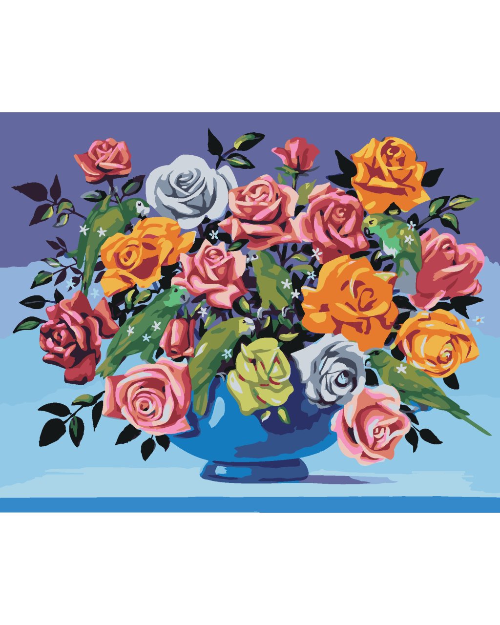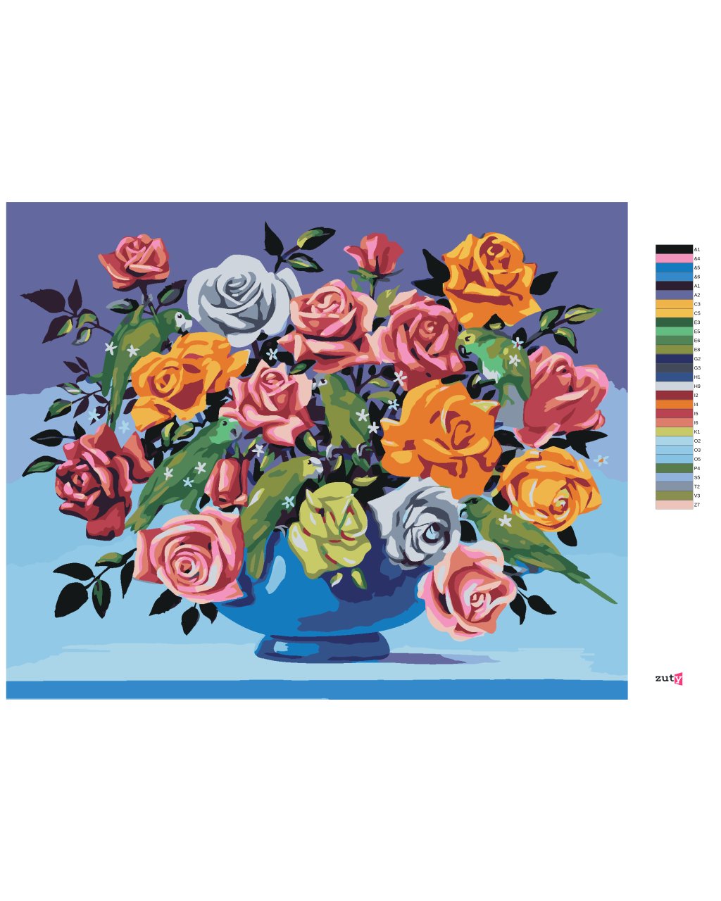 Malování podle čísel - RŮŽE VE VÁZE A PAPOUŠCI (D. RUSTY RUST)