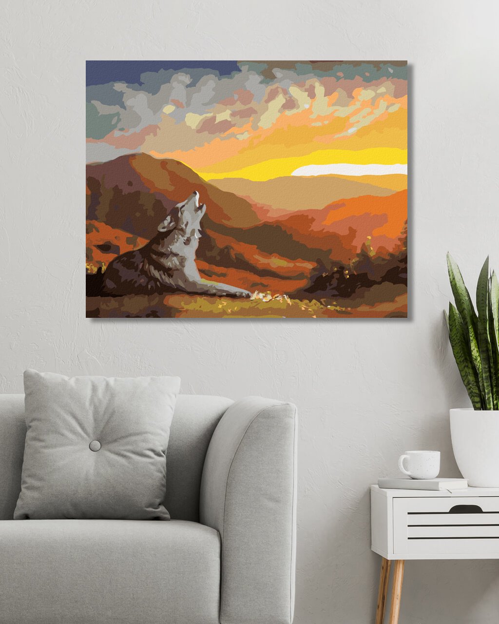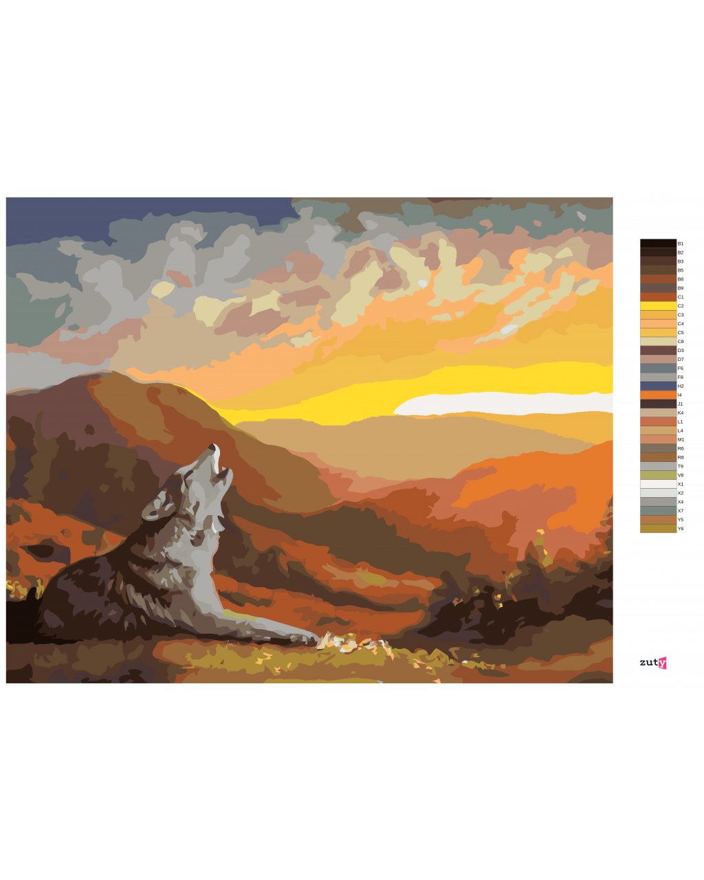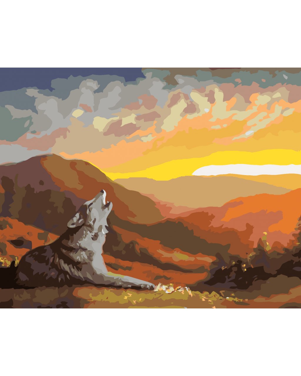 Malování podle čísel - VYJÍCÍ VLK, ZÁPAD SLUNCE A HORY (D. RUSTY RUST)