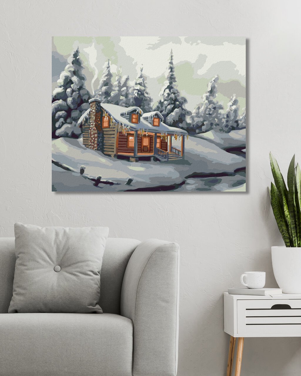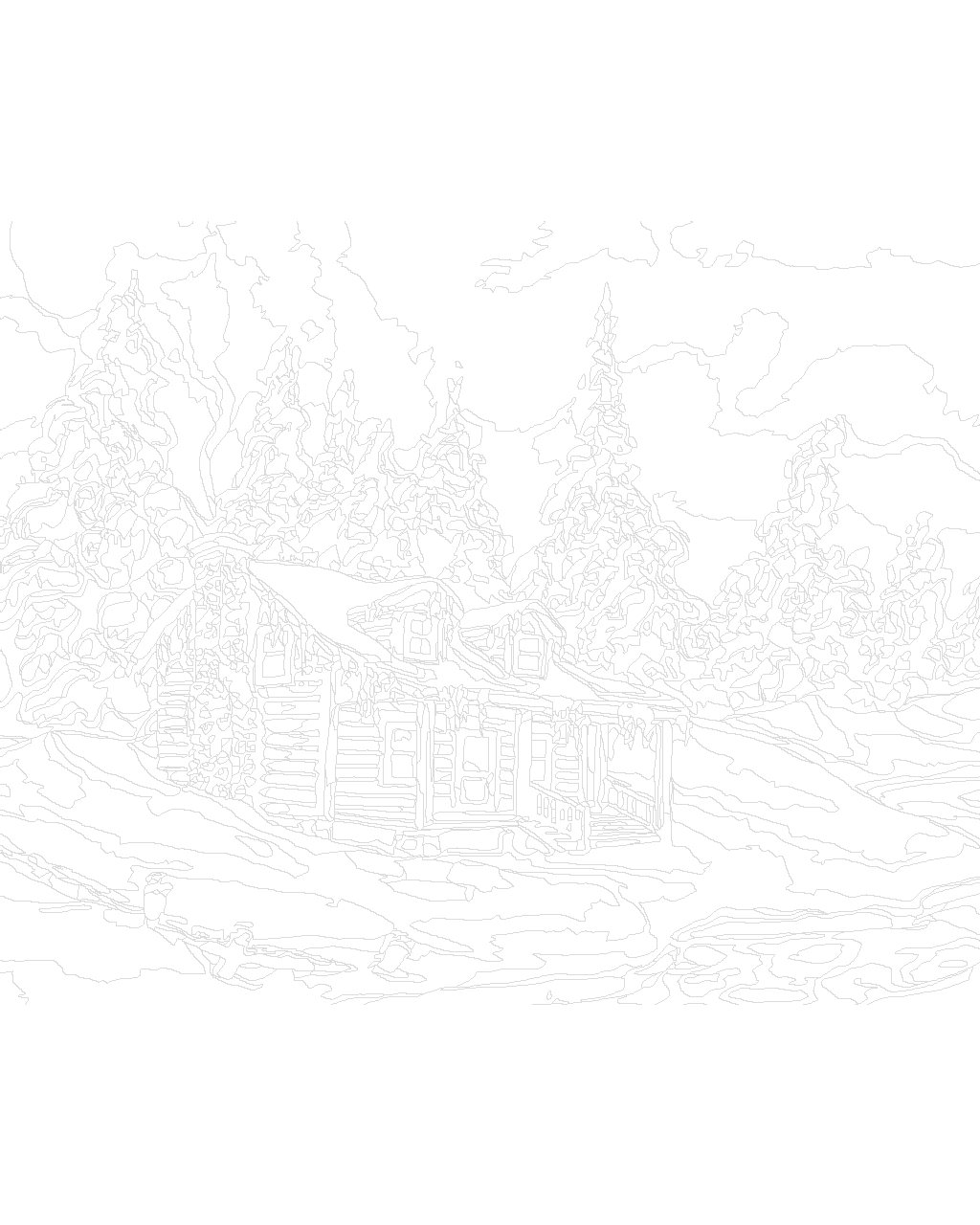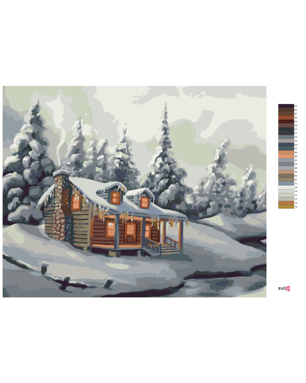 Malování podle čísel - ZASNĚŽENÉ STROMY, ŘEKA A CHATA V ZIMĚ (D. RUSTY RUST)