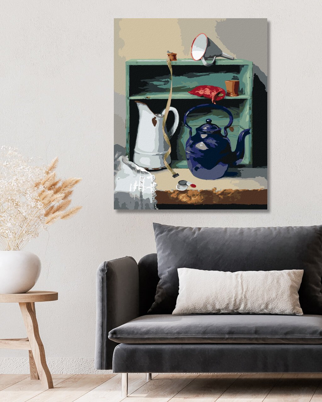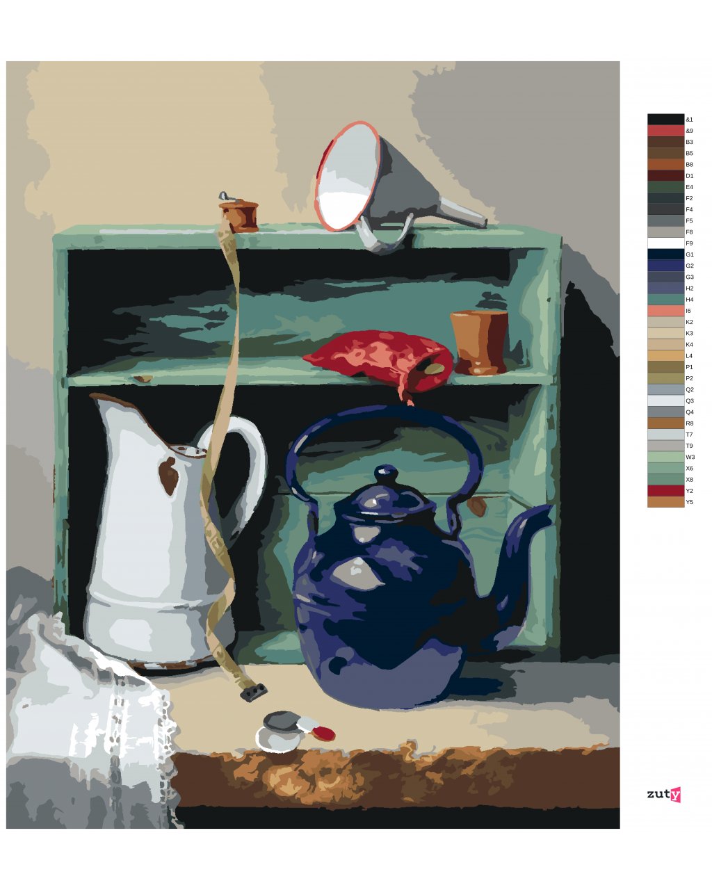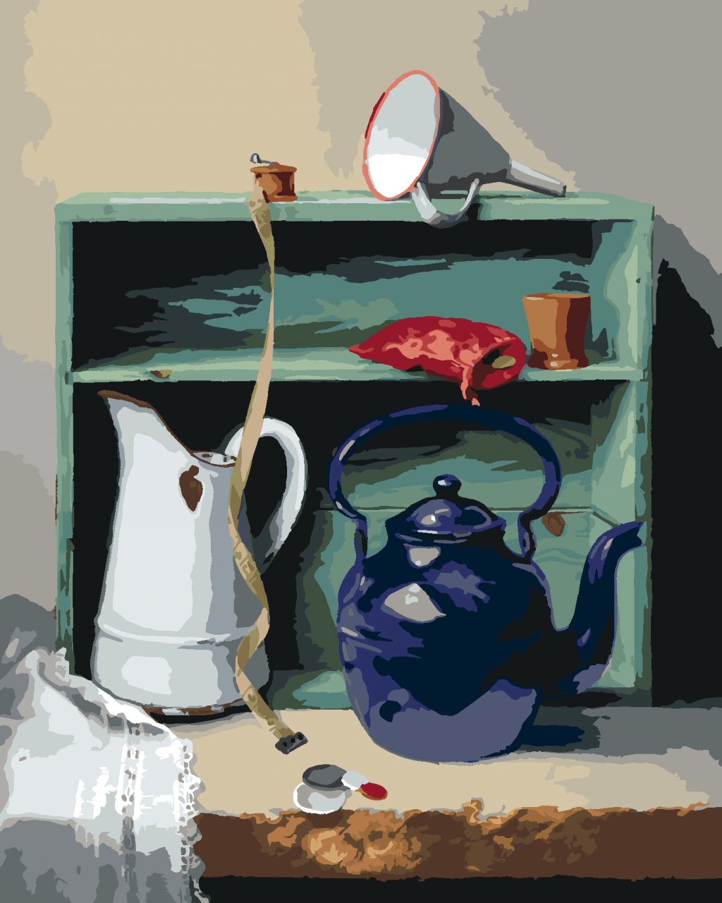 Malování podle čísel - ZÁTIŠÍ KONVICE, KREJČOVSKÝ METR A SKŘÍŇ (PIETER WAGEMANS)