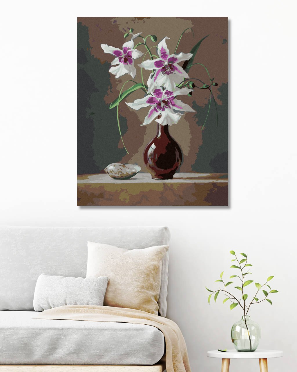 Malování podle čísel - ZÁTIŠÍ ORCHIDEJ V ČERVENÉ VÁZE A MUŠLE (PIETER WAGEMANS)