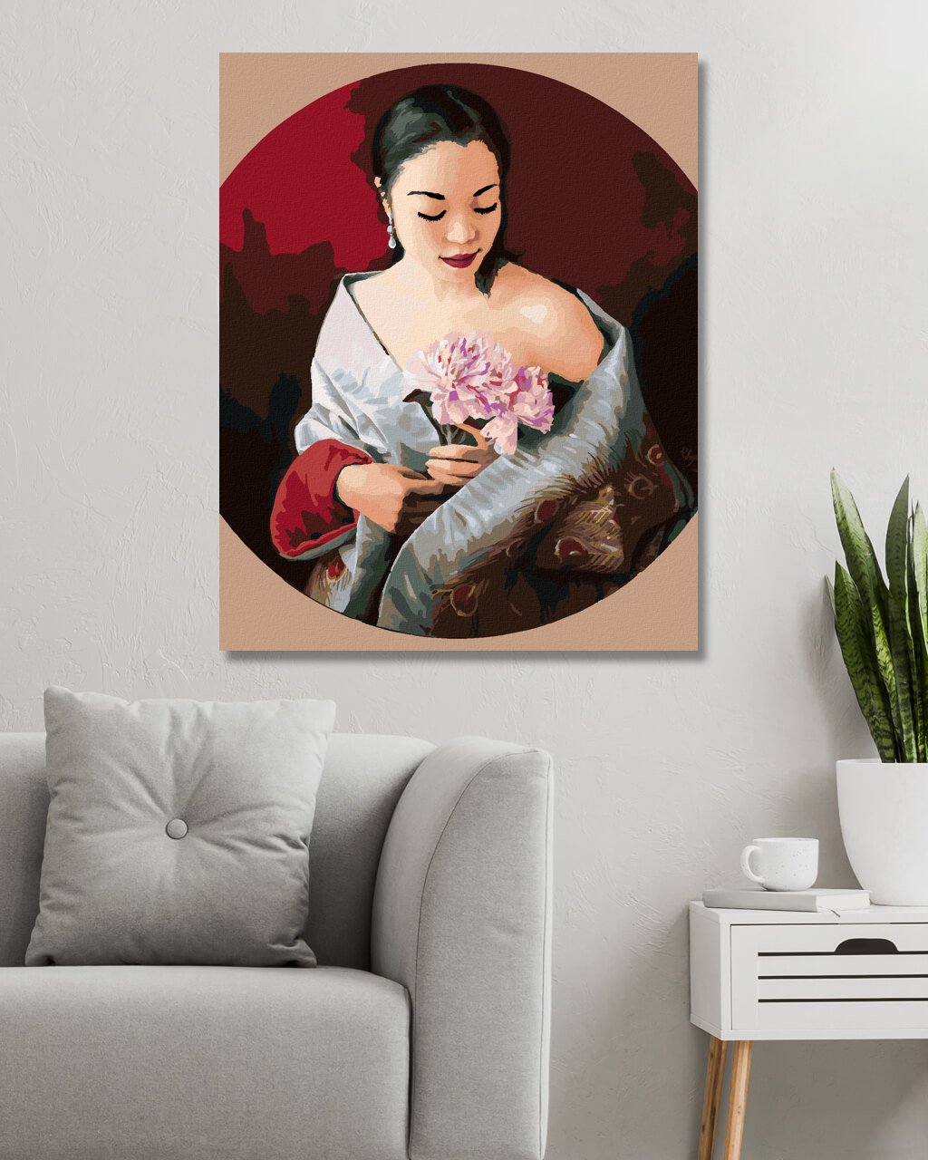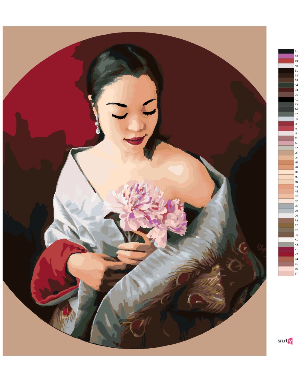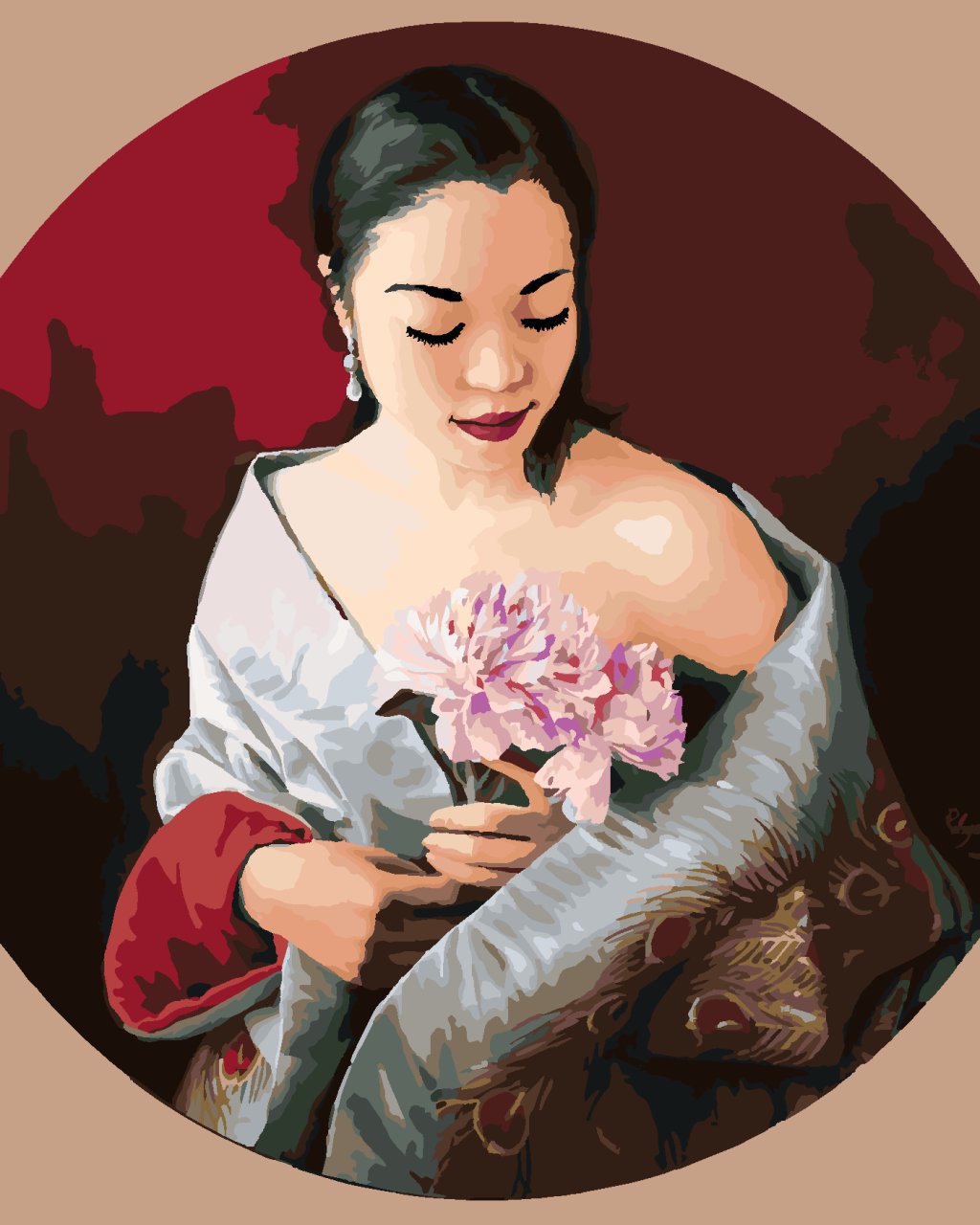 Malování podle čísel - ŽENA V PŘEHOZU S PAVÍM VZOREM A KVĚTINA (PIETER WAGEMANS)