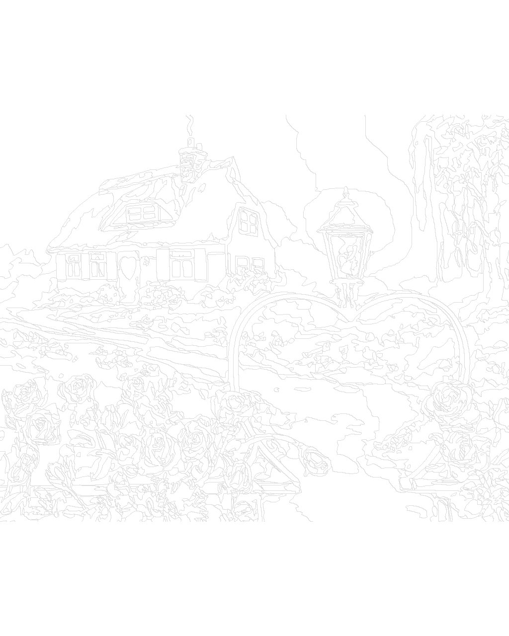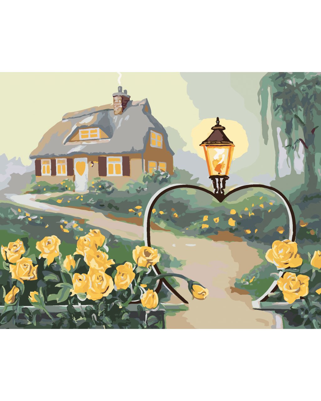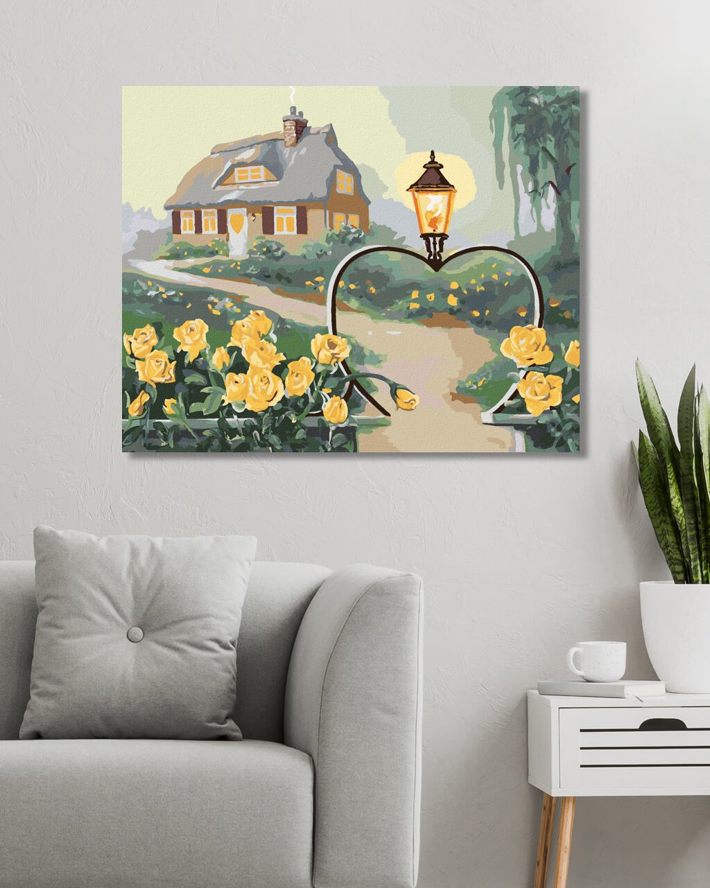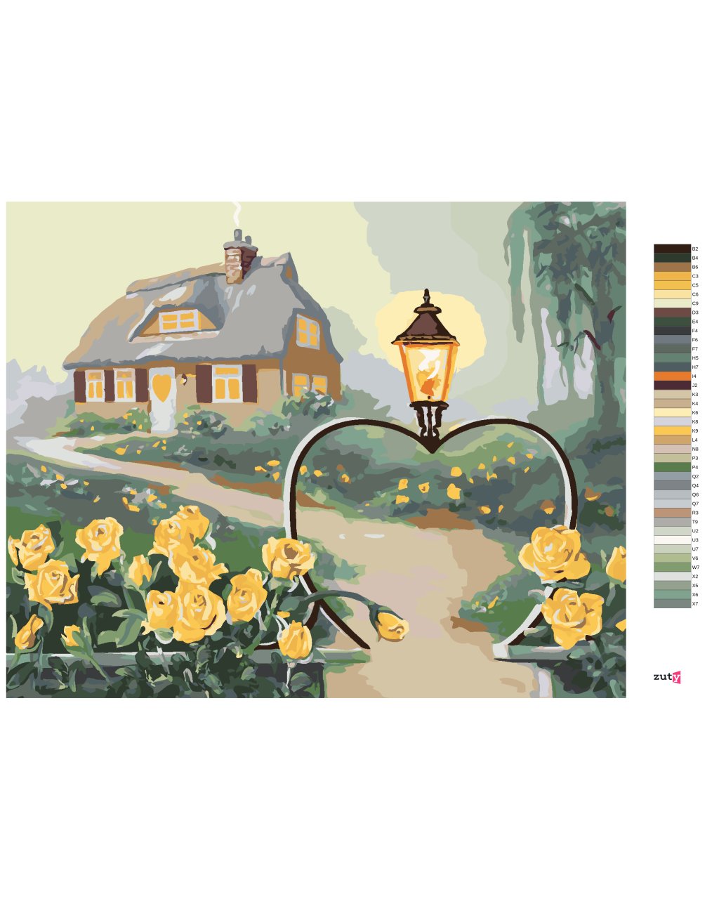 Malování podle čísel - ŽLUTÉ RŮŽE, BRANKA VE TVARU SRDCE S LAMPOU A DŮM (D. RUSTY RUST)